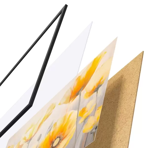 El póster consta de marco, plexiglás, imagen impresa y soporte de aglomerado. El póster puede colgarse inmediatamente en la pared gracias a los soportes de la parte posterior.