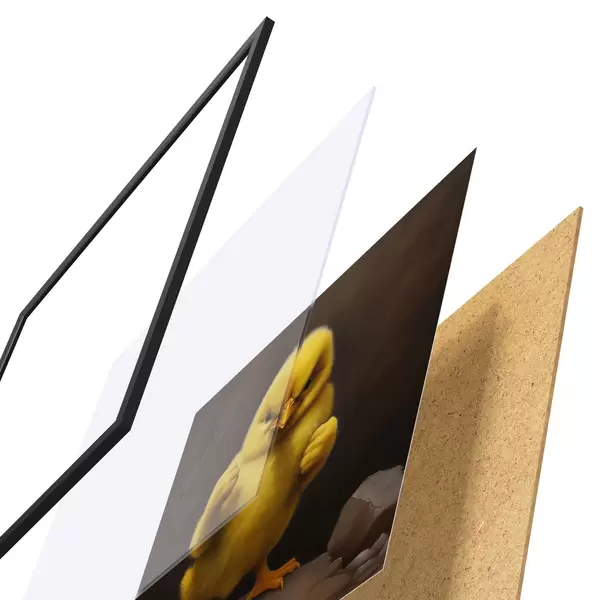 El póster consta de marco, plexiglás, imagen impresa y soporte de aglomerado. El póster puede colgarse inmediatamente en la pared gracias a los soportes de la parte posterior.
