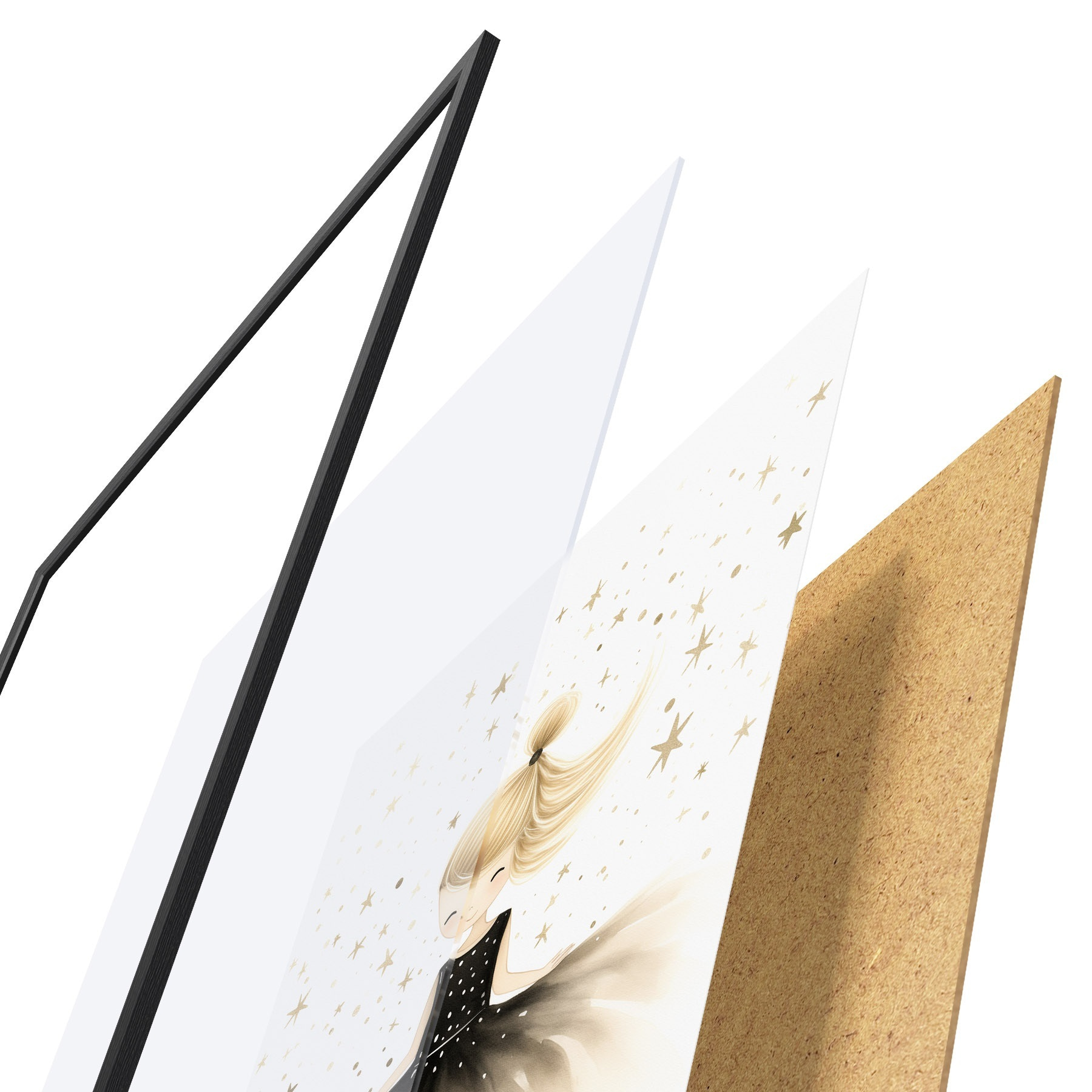 El póster consta de marco, plexiglás, imagen impresa y soporte de aglomerado. El póster puede colgarse inmediatamente en la pared gracias a los soportes de la parte posterior.