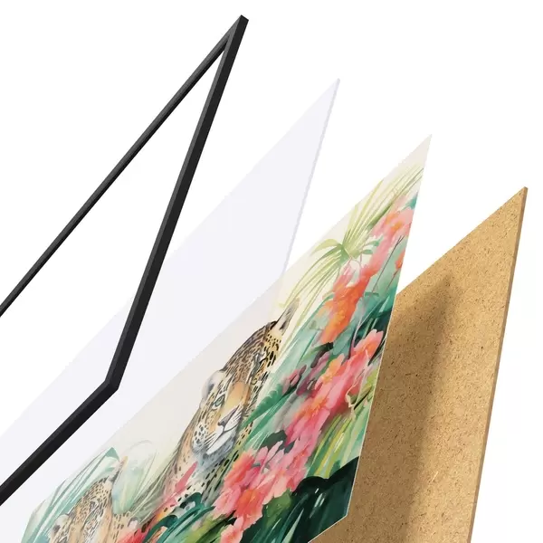 El póster consta de marco, plexiglás, imagen impresa y soporte de aglomerado. El póster puede colgarse inmediatamente en la pared gracias a los soportes de la parte posterior.