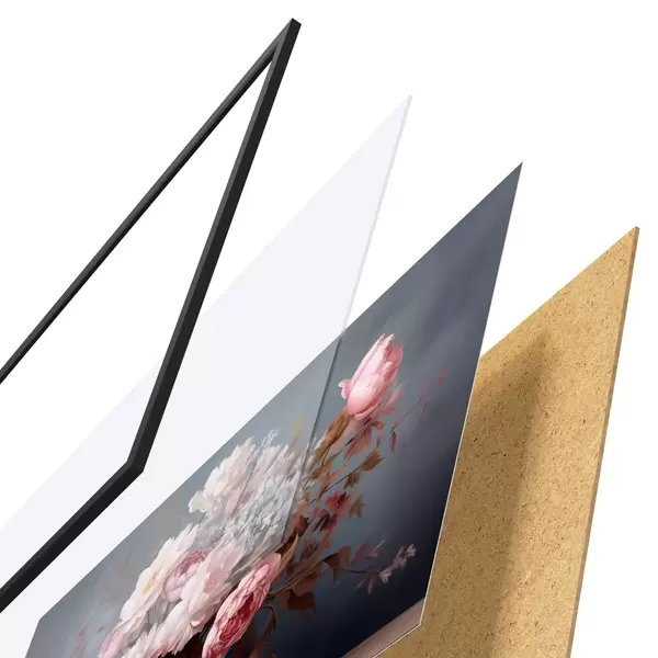 El póster consta de marco, plexiglás, imagen impresa y soporte de aglomerado. El póster puede colgarse inmediatamente en la pared gracias a los soportes de la parte posterior.