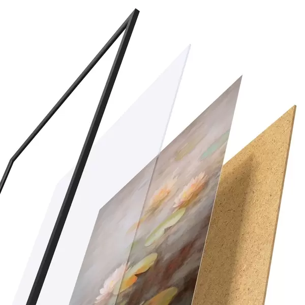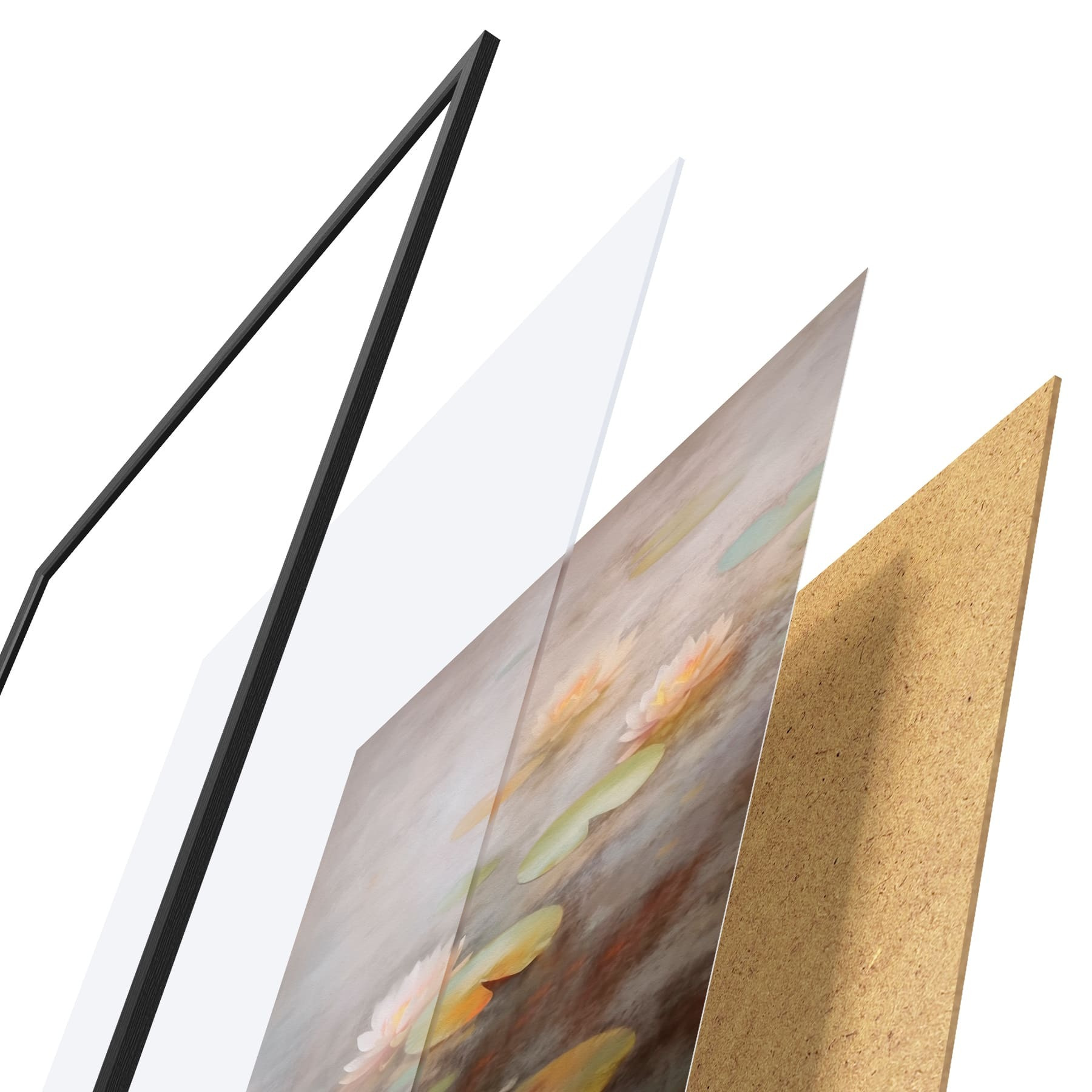 El póster consta de marco, plexiglás, imagen impresa y soporte de aglomerado. El póster puede colgarse inmediatamente en la pared gracias a los soportes de la parte posterior.