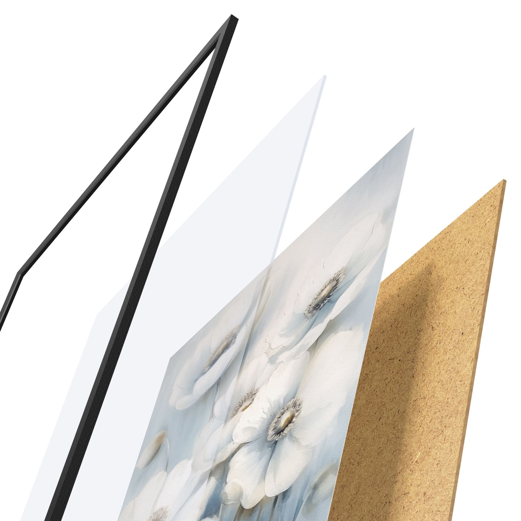 El póster consta de marco, plexiglás, imagen impresa y soporte de aglomerado. El póster puede colgarse inmediatamente en la pared gracias a los soportes de la parte posterior.