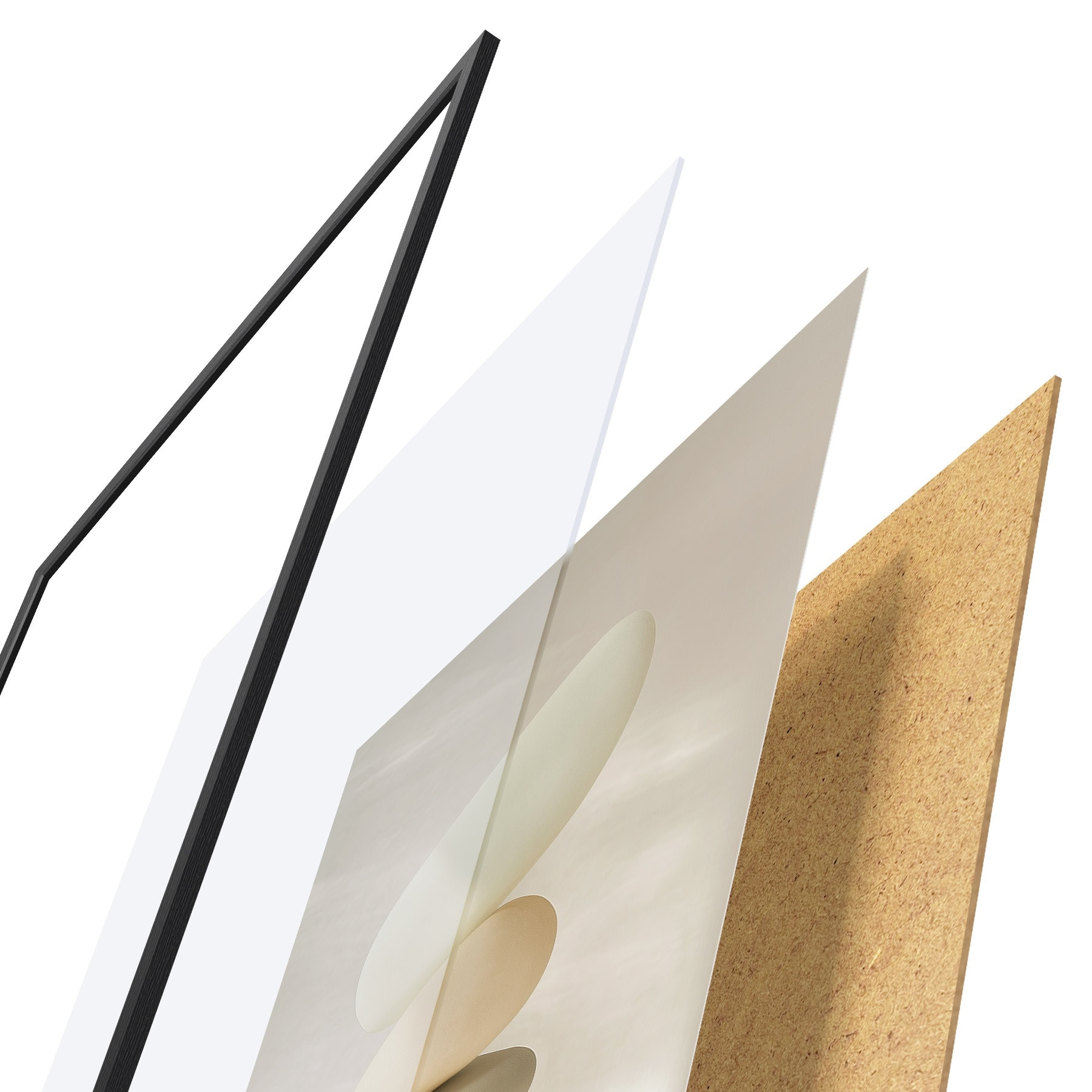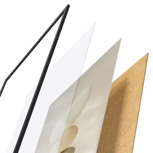 El póster consta de marco, plexiglás, imagen impresa y soporte de aglomerado. El póster puede colgarse inmediatamente en la pared gracias a los soportes de la parte posterior.