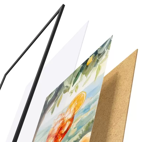 El póster consta de marco, plexiglás, imagen impresa y soporte de aglomerado. El póster puede colgarse inmediatamente en la pared gracias a los soportes de la parte posterior.