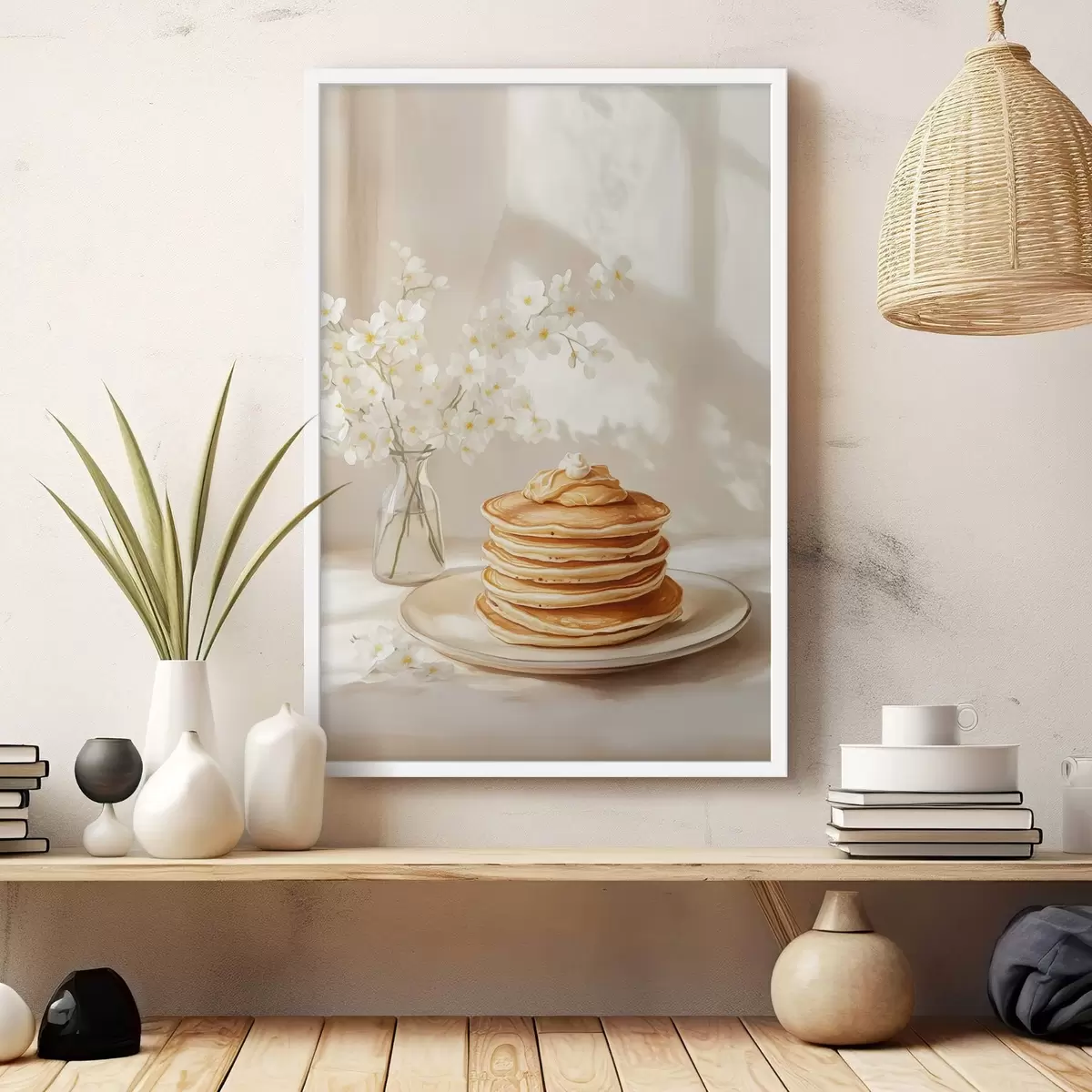 Poster Deliciosas tortitas con mantequilla de cacahuete, estilo acuarela, jarrón con flores blancas Nr f43063
