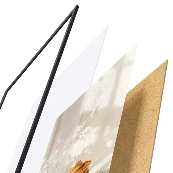 El póster consta de marco, plexiglás, imagen impresa y soporte de aglomerado. El póster puede colgarse inmediatamente en la pared gracias a los soportes de la parte posterior.