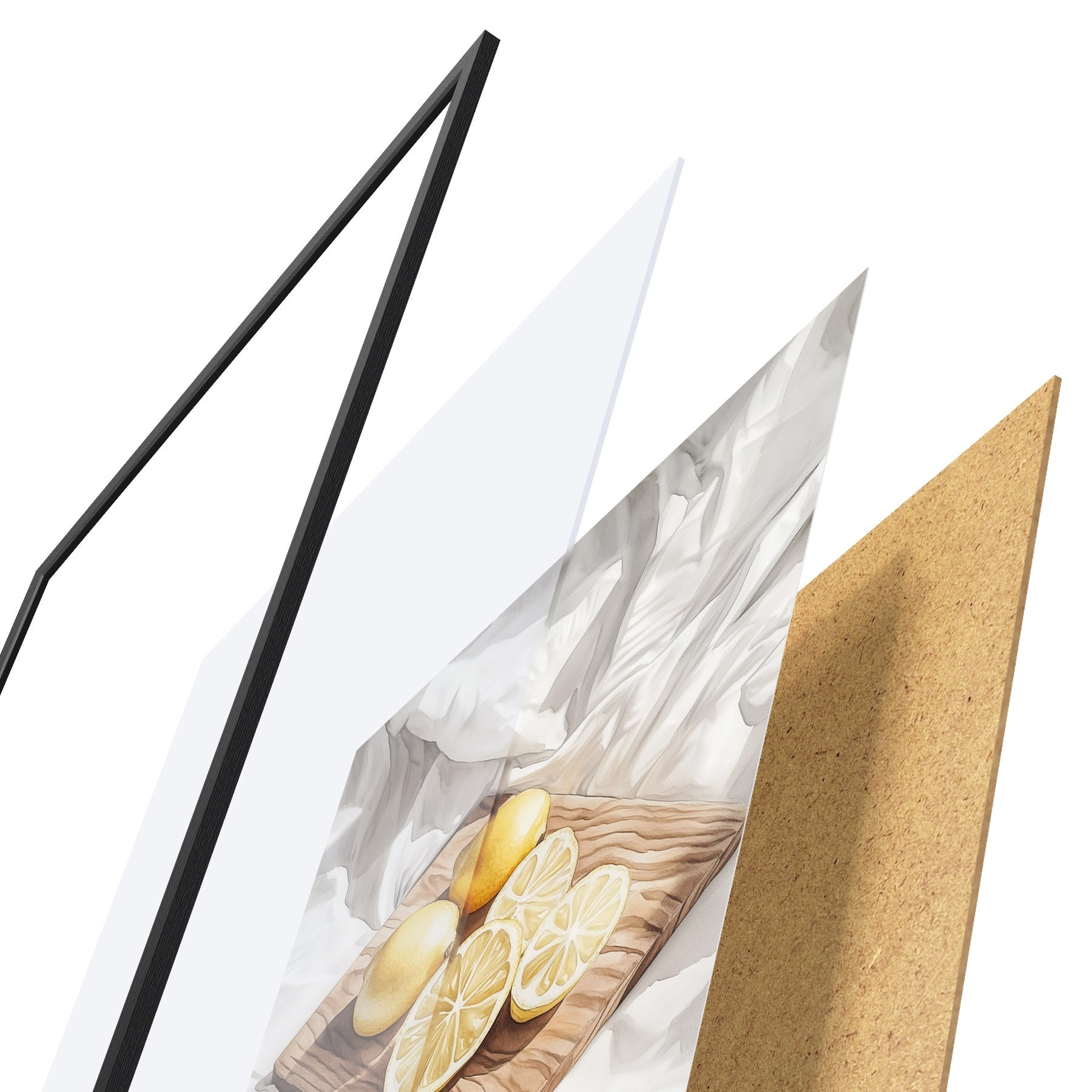 El póster consta de marco, plexiglás, imagen impresa y soporte de aglomerado. El póster puede colgarse inmediatamente en la pared gracias a los soportes de la parte posterior.