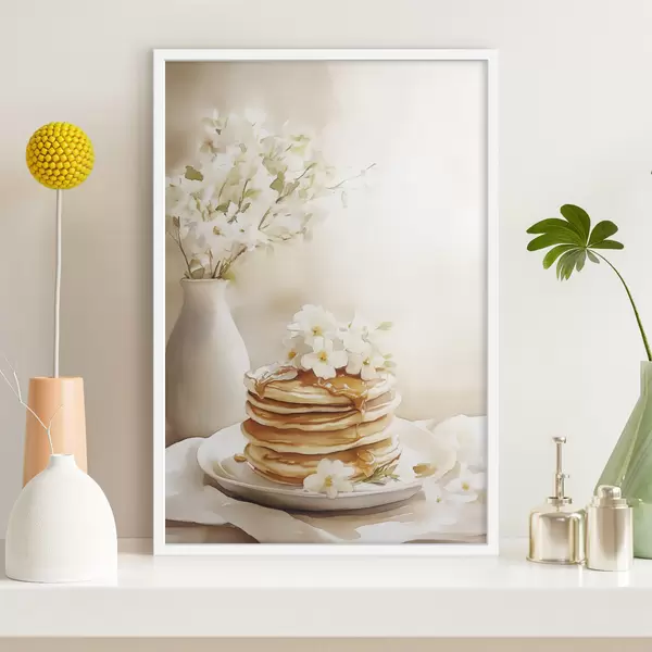 Poster Tortitas con mantequilla de cacahuete, flores blancas, dibujo estilo acuarela f43065