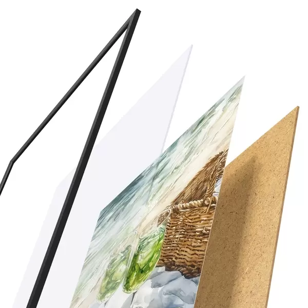 El póster consta de marco, plexiglás, imagen impresa y soporte de aglomerado. El póster puede colgarse inmediatamente en la pared gracias a los soportes de la parte posterior.