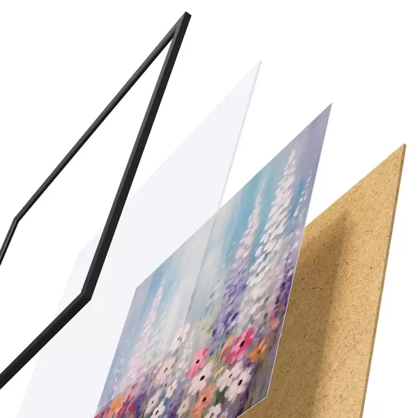 El póster consta de marco, plexiglás, imagen impresa y soporte de aglomerado. El póster puede colgarse inmediatamente en la pared gracias a los soportes de la parte posterior.