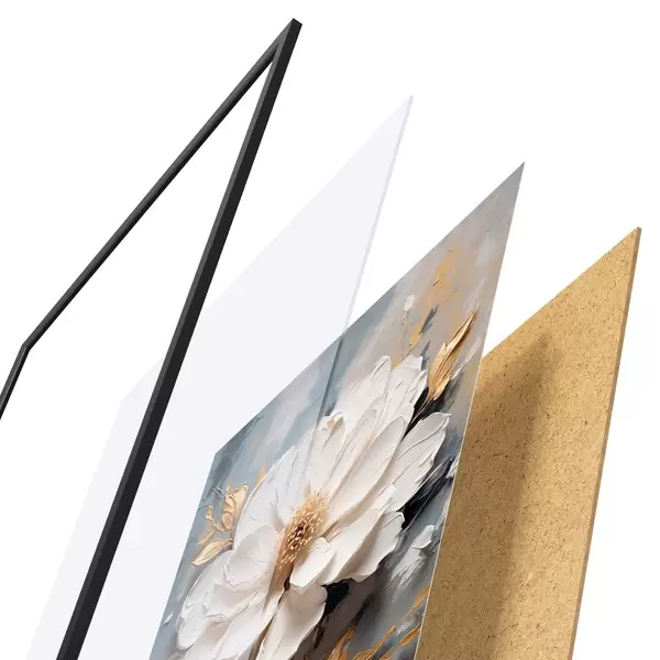El póster consta de marco, plexiglás, imagen impresa y soporte de aglomerado. El póster puede colgarse inmediatamente en la pared gracias a los soportes de la parte posterior.