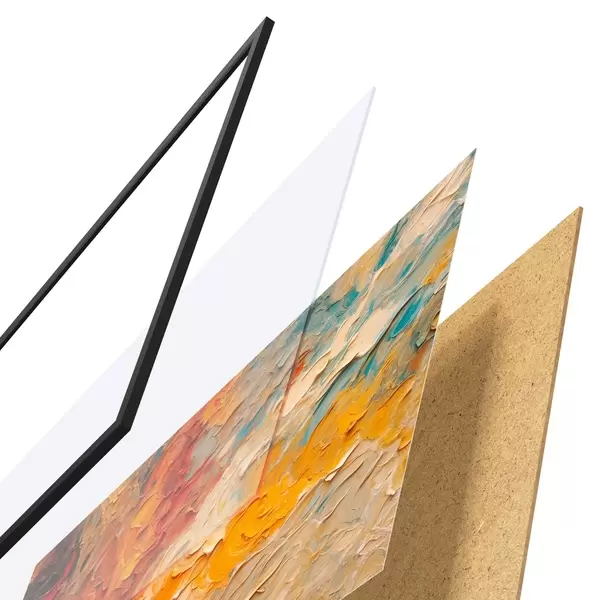 El póster consta de marco, plexiglás, imagen impresa y soporte de aglomerado. El póster puede colgarse inmediatamente en la pared gracias a los soportes de la parte posterior.