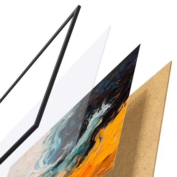 El póster consta de marco, plexiglás, imagen impresa y soporte de aglomerado. El póster puede colgarse inmediatamente en la pared gracias a los soportes de la parte posterior.