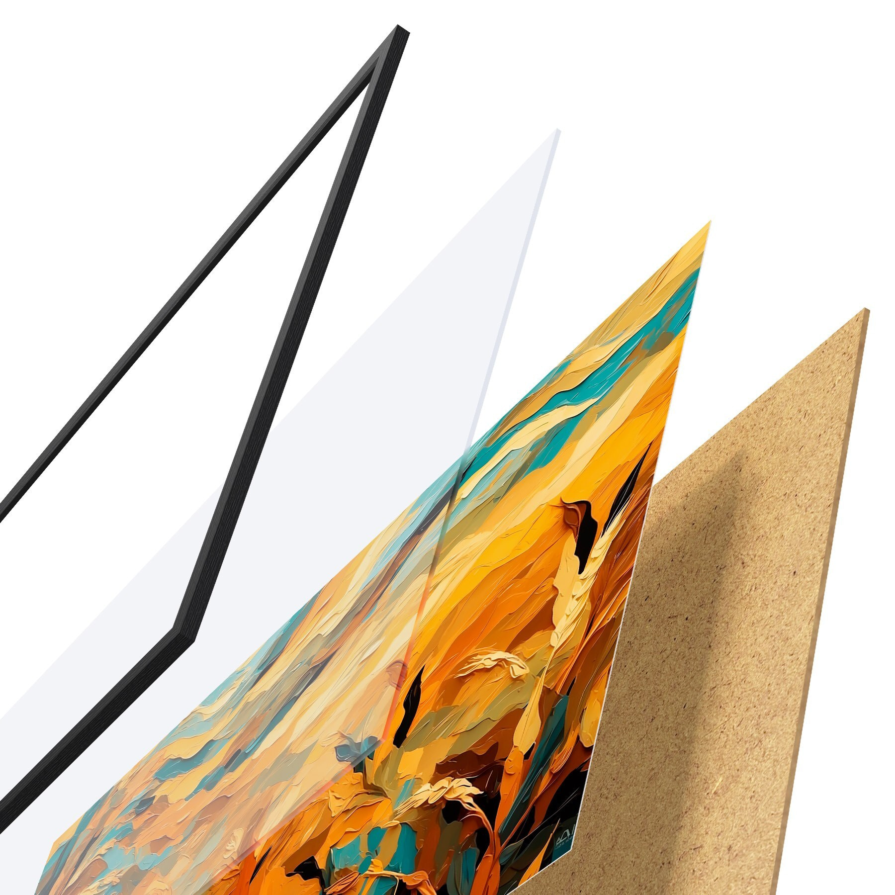 El póster consta de marco, plexiglás, imagen impresa y soporte de aglomerado. El póster puede colgarse inmediatamente en la pared gracias a los soportes de la parte posterior.