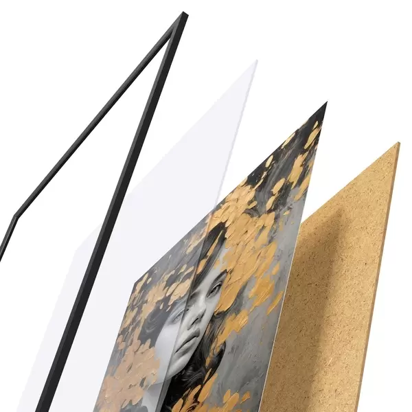 El póster consta de marco, plexiglás, imagen impresa y soporte de aglomerado. El póster puede colgarse inmediatamente en la pared gracias a los soportes de la parte posterior.