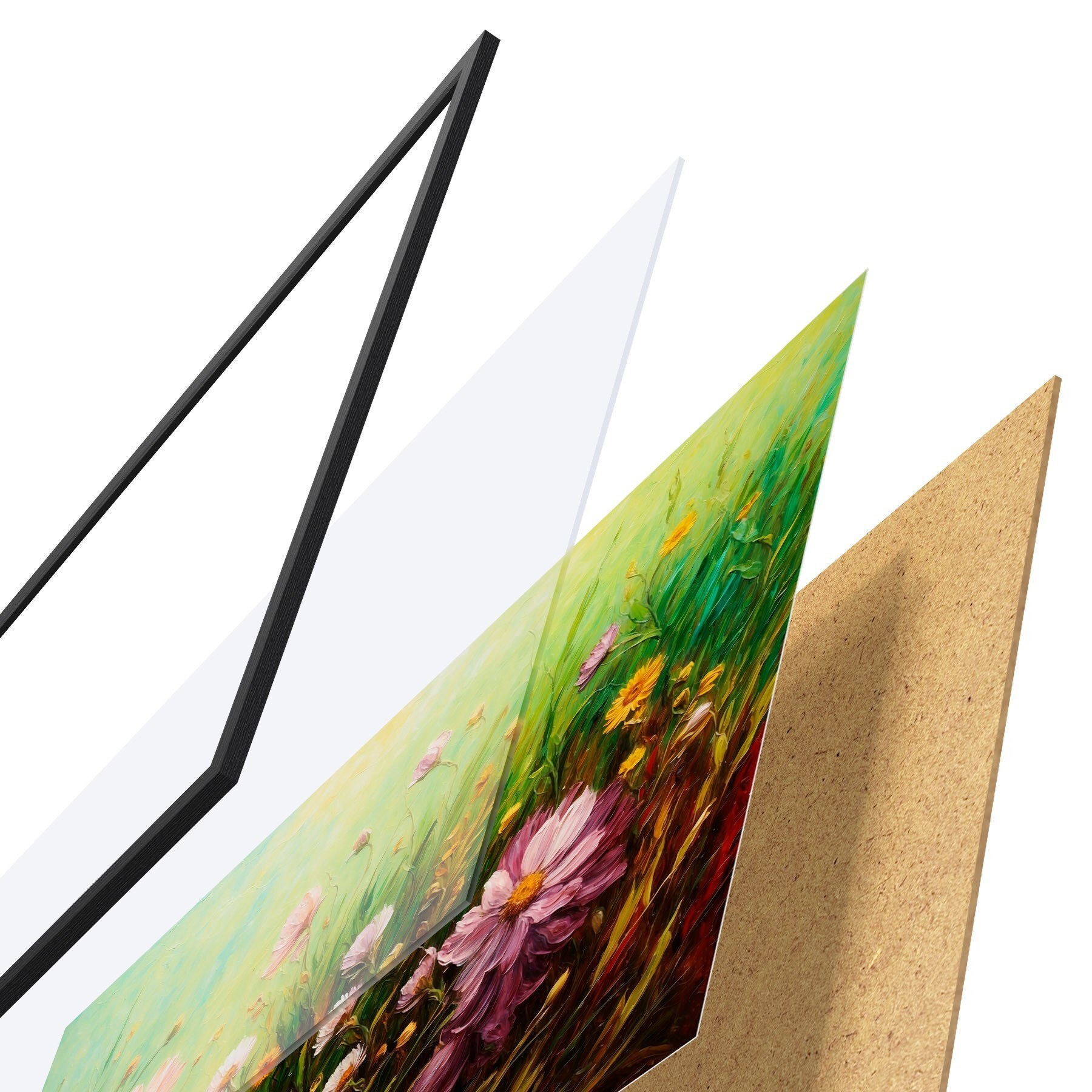El póster consta de marco, plexiglás, imagen impresa y soporte de aglomerado. El póster puede colgarse inmediatamente en la pared gracias a los soportes de la parte posterior.