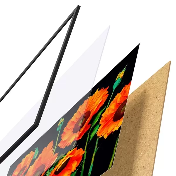 El póster consta de marco, plexiglás, imagen impresa y soporte de aglomerado. El póster puede colgarse inmediatamente en la pared gracias a los soportes de la parte posterior.
