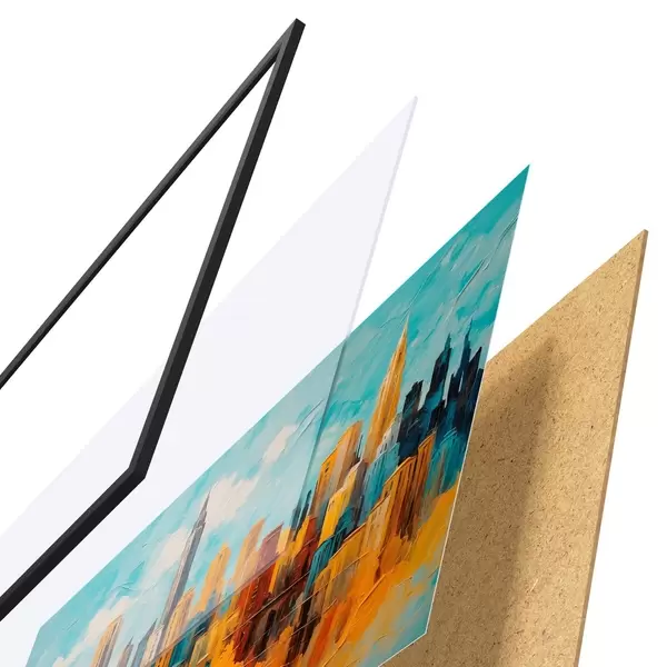 El póster consta de marco, plexiglás, imagen impresa y soporte de aglomerado. El póster puede colgarse inmediatamente en la pared gracias a los soportes de la parte posterior.