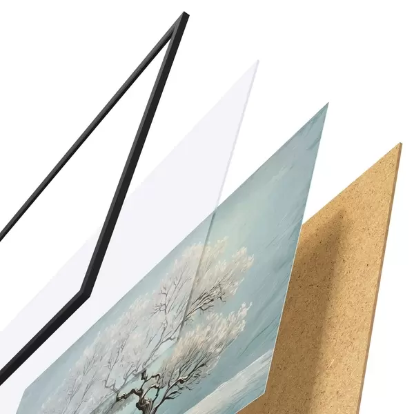 El póster consta de marco, plexiglás, imagen impresa y soporte de aglomerado. El póster puede colgarse inmediatamente en la pared gracias a los soportes de la parte posterior.