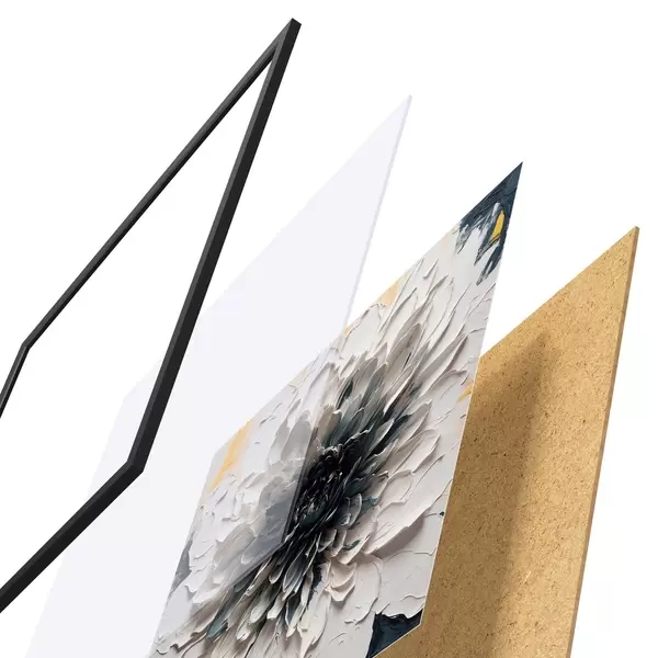 El póster consta de marco, plexiglás, imagen impresa y soporte de aglomerado. El póster puede colgarse inmediatamente en la pared gracias a los soportes de la parte posterior.