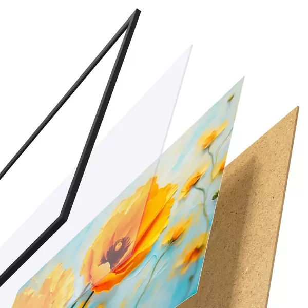 El póster consta de marco, plexiglás, imagen impresa y soporte de aglomerado. El póster puede colgarse inmediatamente en la pared gracias a los soportes de la parte posterior.