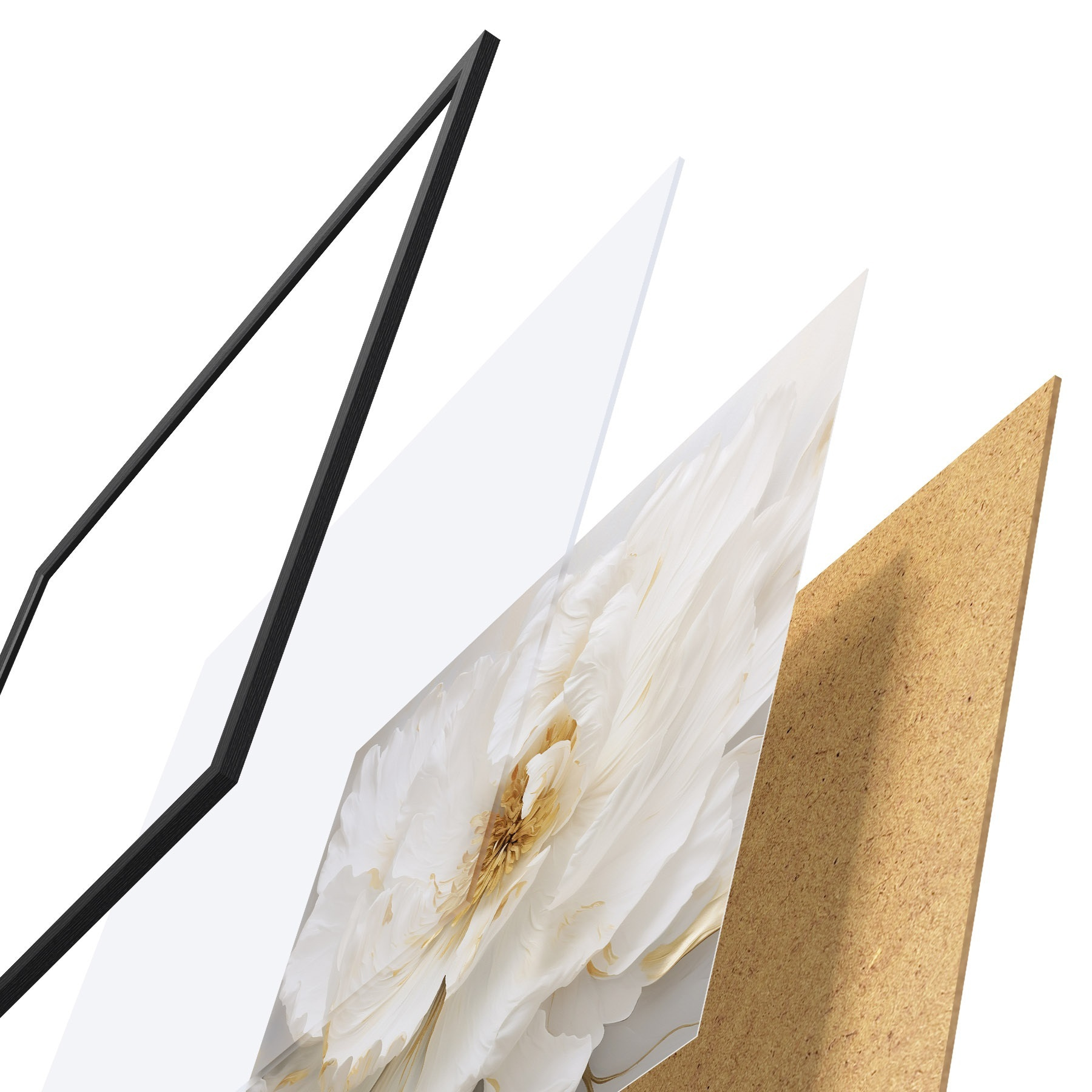 El póster consta de marco, plexiglás, imagen impresa y soporte de aglomerado. El póster puede colgarse inmediatamente en la pared gracias a los soportes de la parte posterior.