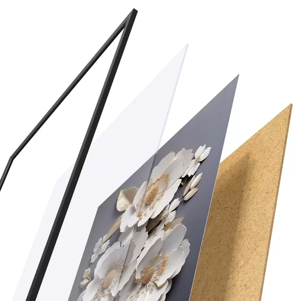 El póster consta de marco, plexiglás, imagen impresa y soporte de aglomerado. El póster puede colgarse inmediatamente en la pared gracias a los soportes de la parte posterior.