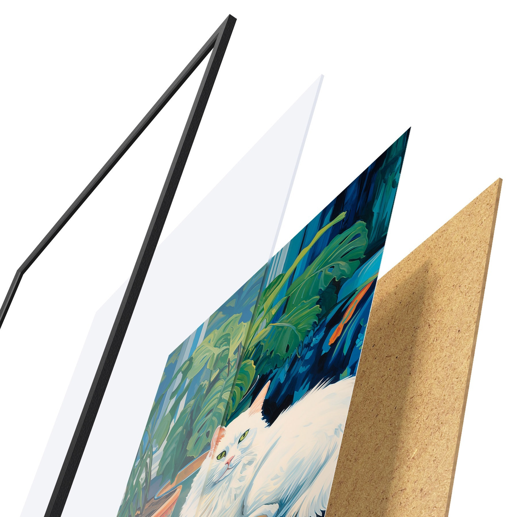 El póster consta de marco, plexiglás, imagen impresa y soporte de aglomerado. El póster puede colgarse inmediatamente en la pared gracias a los soportes de la parte posterior.