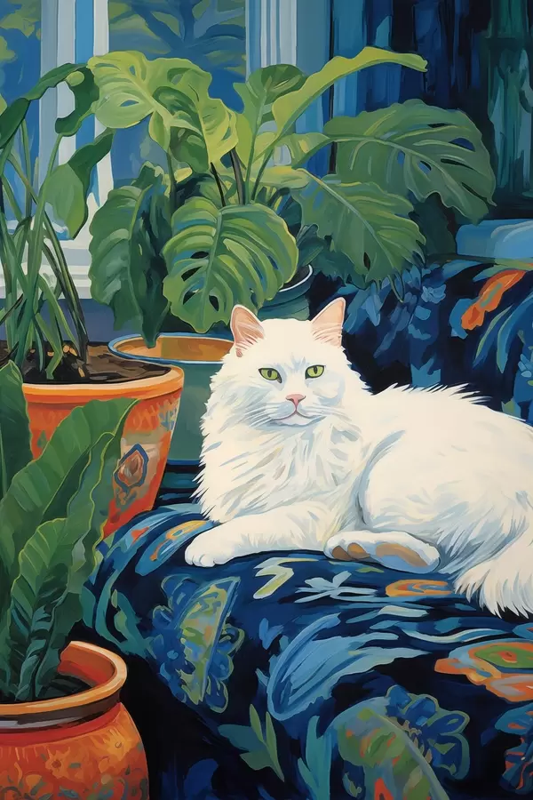 Poster Un gato blanco entre exuberante vegetación y macetas de cerámica f43131