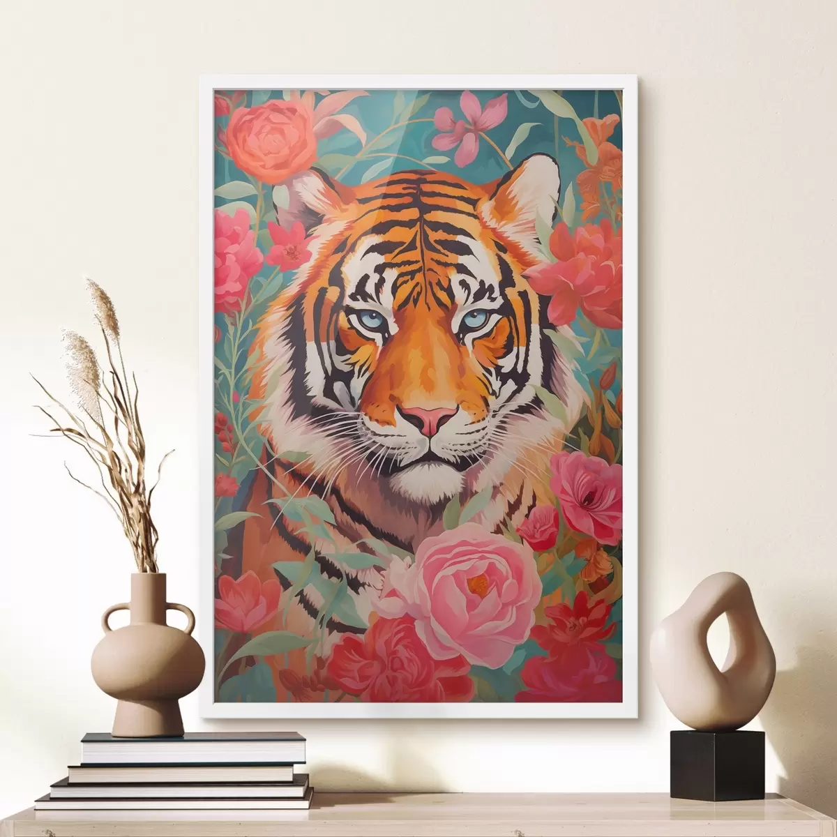 Poster La hipnotizante mirada de un tigre entre rosas vibrantes f43132
