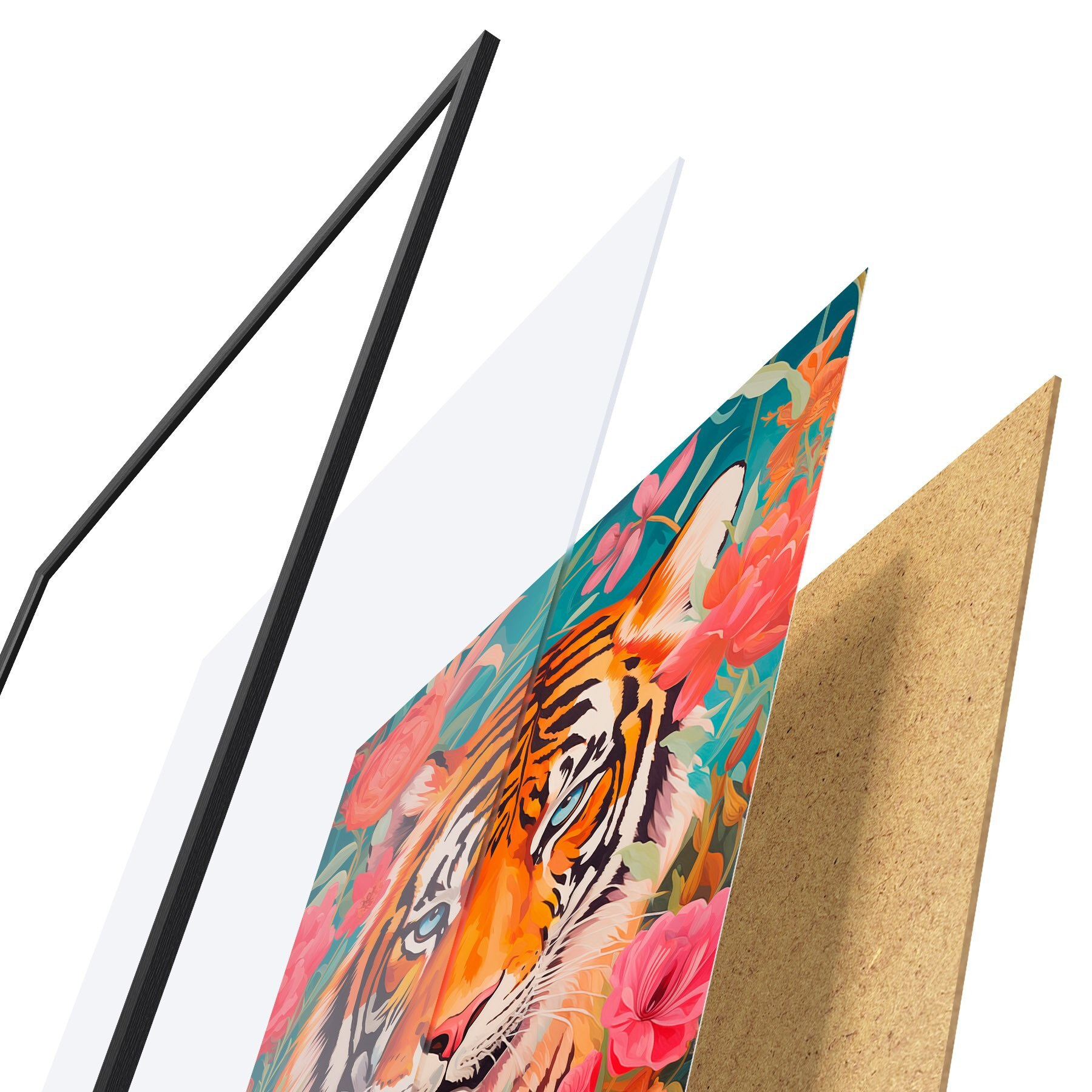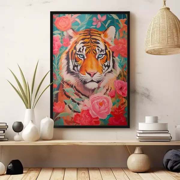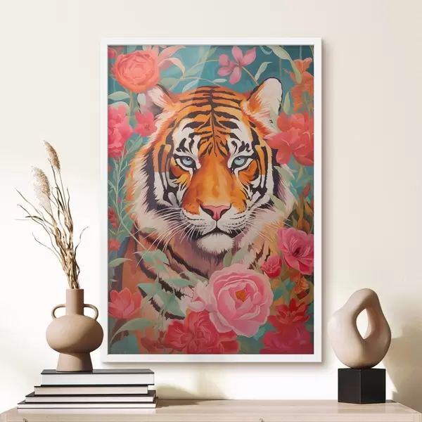 Poster La hipnotizante mirada de un tigre entre rosas vibrantes Nr f43132