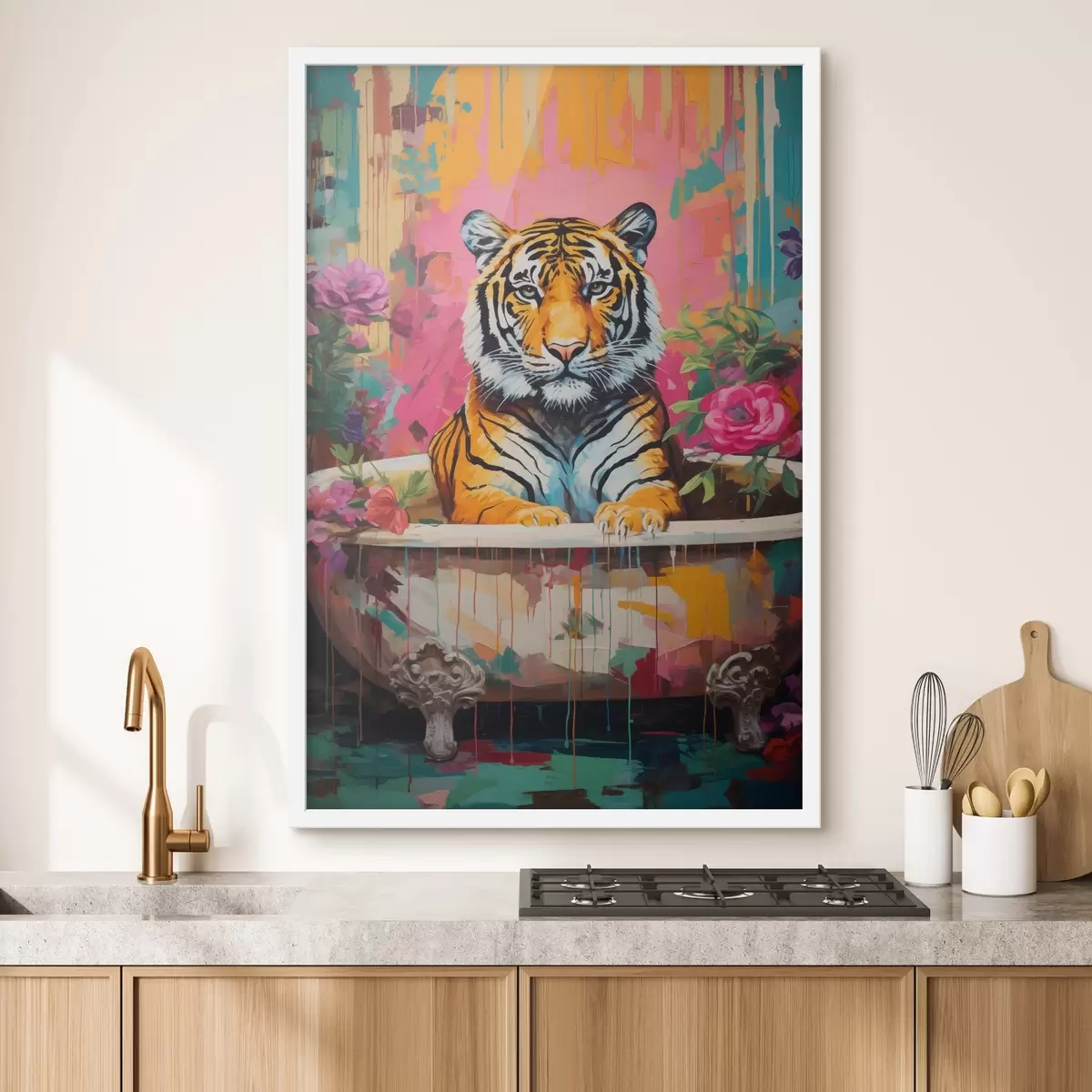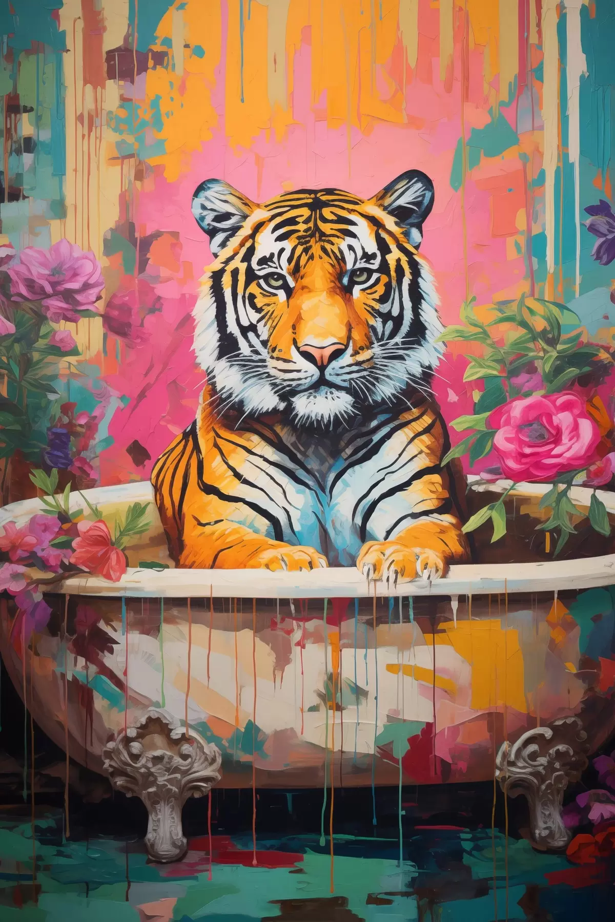 Poster Un tigre abstracto en una bañera, rodeado de flores vibrantes Nr f43134
