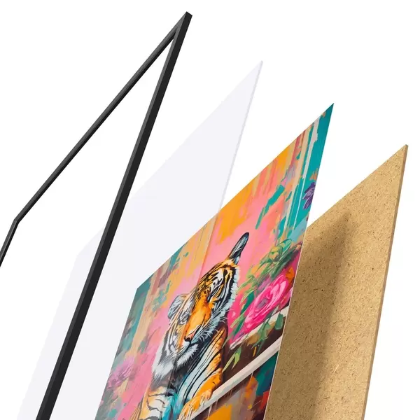 El póster consta de marco, plexiglás, imagen impresa y soporte de aglomerado. El póster puede colgarse inmediatamente en la pared gracias a los soportes de la parte posterior.