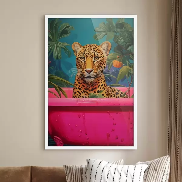 Poster Un leopardo en una bañera rosa entre plantas exóticas Nr f43135