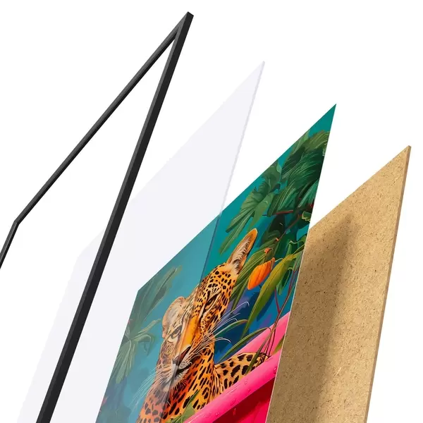 El póster consta de marco, plexiglás, imagen impresa y soporte de aglomerado. El póster puede colgarse inmediatamente en la pared gracias a los soportes de la parte posterior.