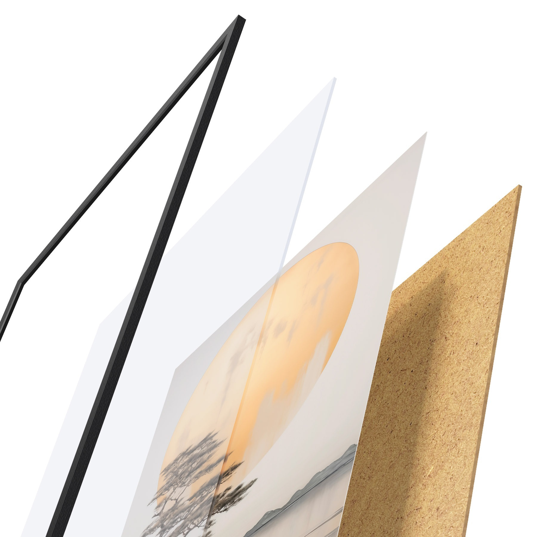 El póster consta de marco, plexiglás, imagen impresa y soporte de aglomerado. El póster puede colgarse inmediatamente en la pared gracias a los soportes de la parte posterior.