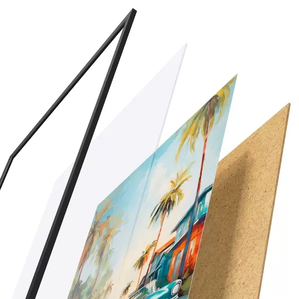El póster consta de marco, plexiglás, imagen impresa y soporte de aglomerado. El póster puede colgarse inmediatamente en la pared gracias a los soportes de la parte posterior.