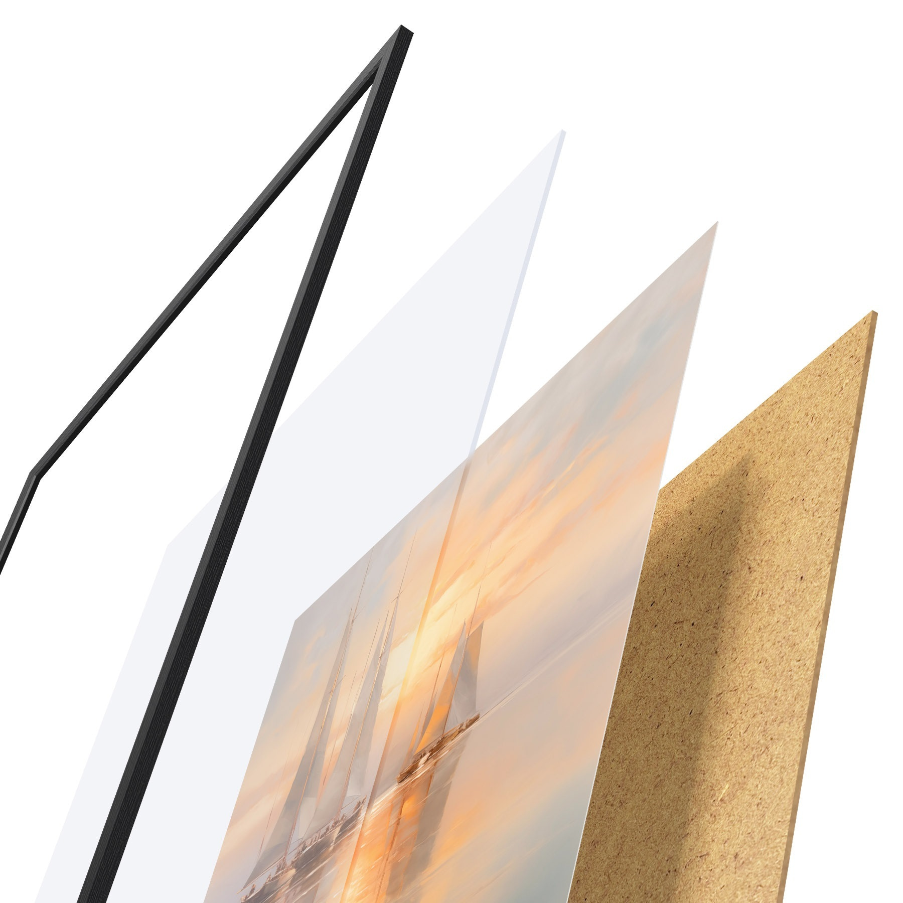 El póster consta de marco, plexiglás, imagen impresa y soporte de aglomerado. El póster puede colgarse inmediatamente en la pared gracias a los soportes de la parte posterior.