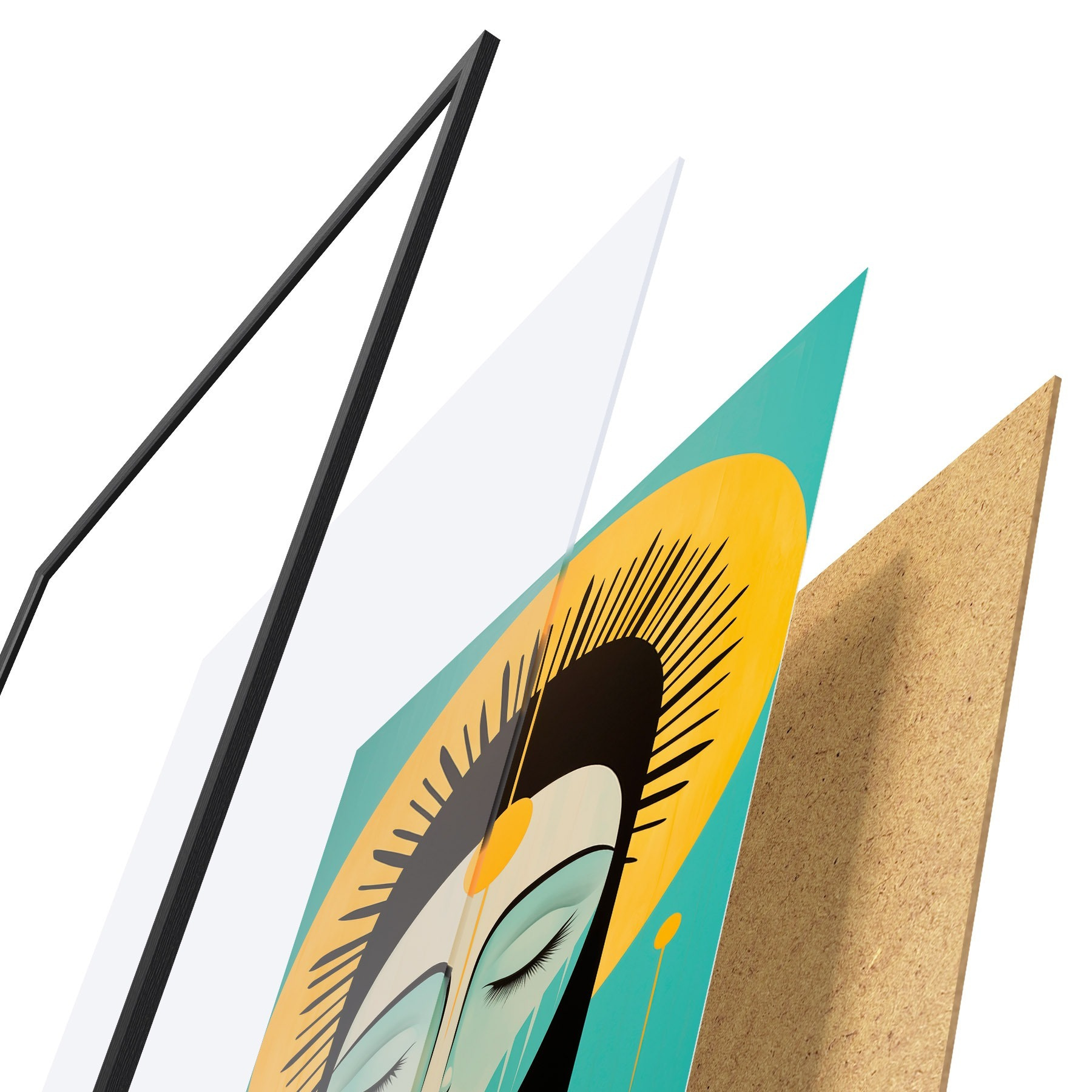 El póster consta de marco, plexiglás, imagen impresa y soporte de aglomerado. El póster puede colgarse inmediatamente en la pared gracias a los soportes de la parte posterior.