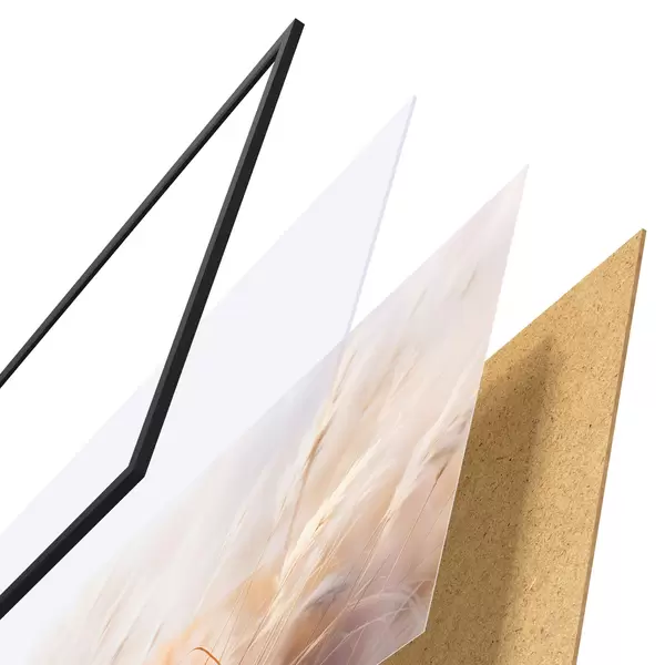 El póster consta de marco, plexiglás, imagen impresa y soporte de aglomerado. El póster puede colgarse inmediatamente en la pared gracias a los soportes de la parte posterior.