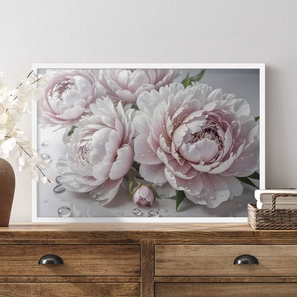 Poster Peonías de color rosa claro y blanco con gotas de agua en los pétalos, el fondo es una superficie blanca f43158