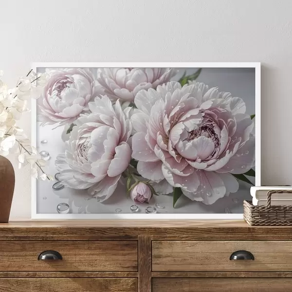Poster Peonías de color rosa claro y blanco con gotas de agua en los pétalos, el fondo es una superficie blanca Nr f43158