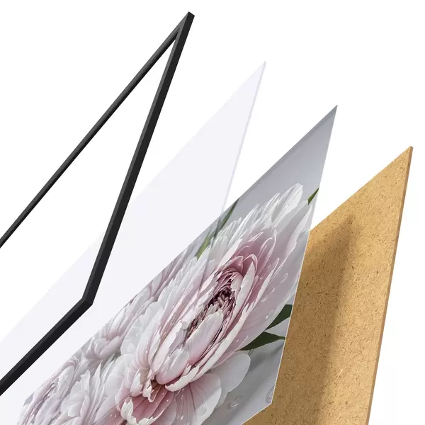 El póster consta de marco, plexiglás, imagen impresa y soporte de aglomerado. El póster puede colgarse inmediatamente en la pared gracias a los soportes de la parte posterior.