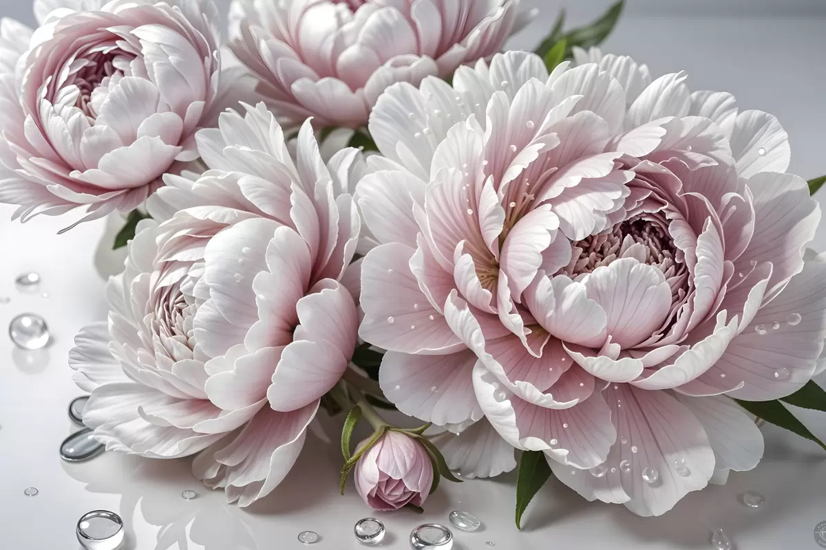 Poster Peonías de color rosa claro y blanco con gotas de agua en los pétalos, el fondo es una superficie blanca Nr f43158
