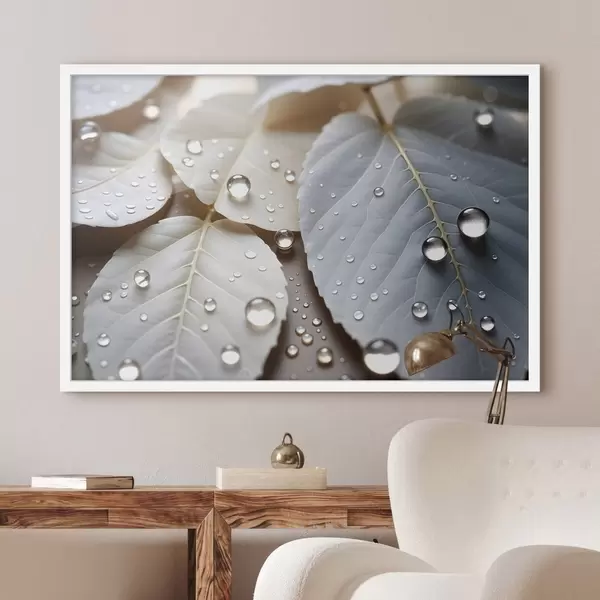 Poster Primer plano de hojas blancas cubiertas de gotas de agua, una composición minimalista, fondo neutro Nr f43159