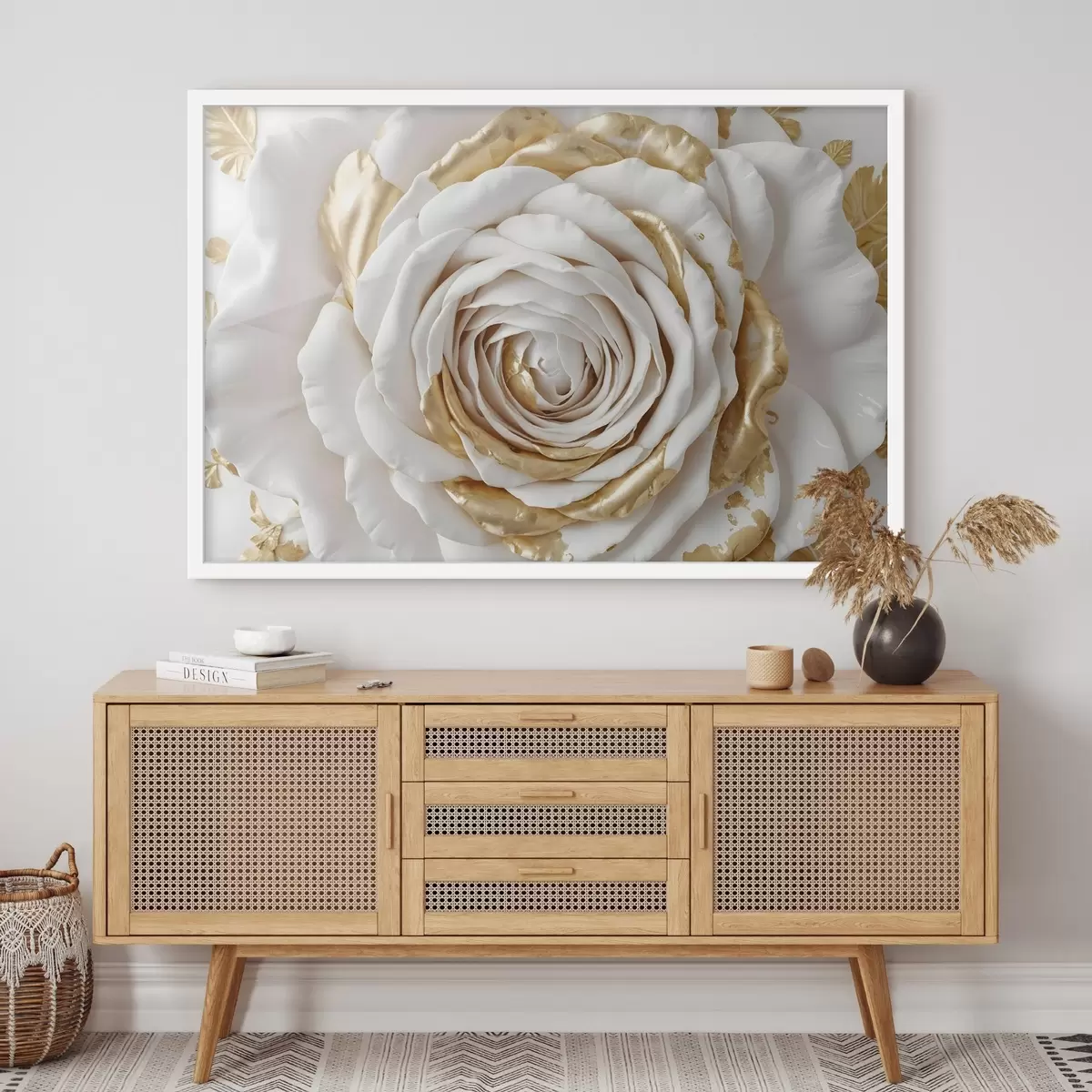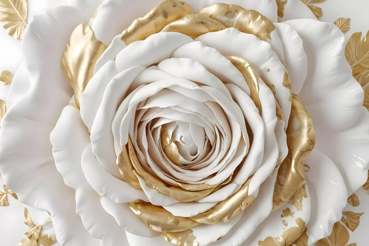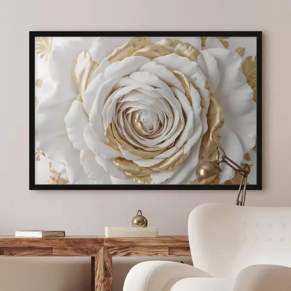 Poster Una rosa decorativa minimalista blanca con detalles amarillos, los pétalos están en capas y rizados Nr f43160
