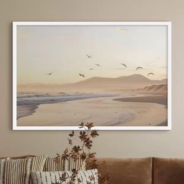 Poster Pájaros volando sobre la playa con océano, montañas en el fondo, colores cálidos, paleta pastel suave f43162