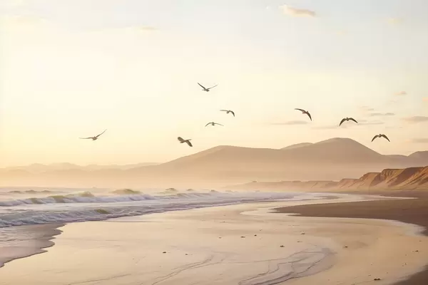 Poster Pájaros volando sobre la playa con océano, montañas en el fondo, colores cálidos, paleta pastel suave f43162