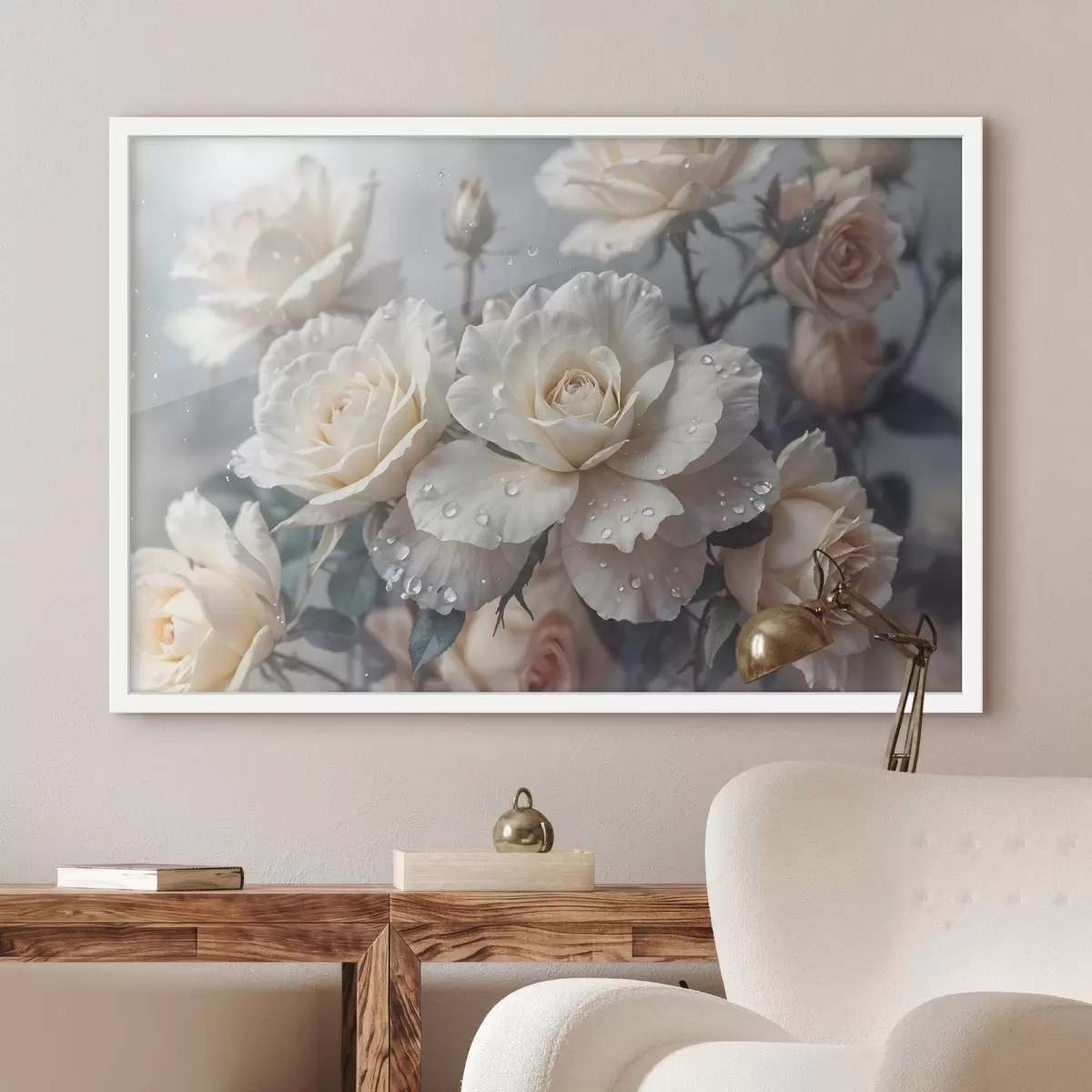 Poster Un grupo de rosas blancas con gotas de agua en los pétalos, algunas hojas verdes, fondo apagado, luz suave Nr f43163